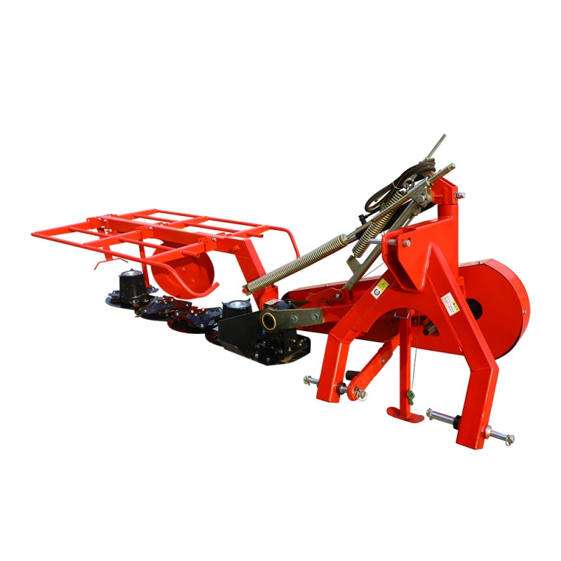 Mecanismo de corte, composto principalmente por múltiplos discos. O cortador de corte do disco de feno geralmente é equipado com vários discos rotativos de alta velocidade, cada um com 2-3 lâminas. As lâminas estão articuladas nos discos e, quando os discos giram em alta velocidade, as lâminas mantêm o estado de corte sob a ação da força centrífuga. Ao encontrar grandes obstáculos, as lâminas podem ser empurradas para trás para evitar danos, e as lâminas podem ser usadas do outro lado depois que um lado da lâmina é usado, o que é conveniente para a substituição.